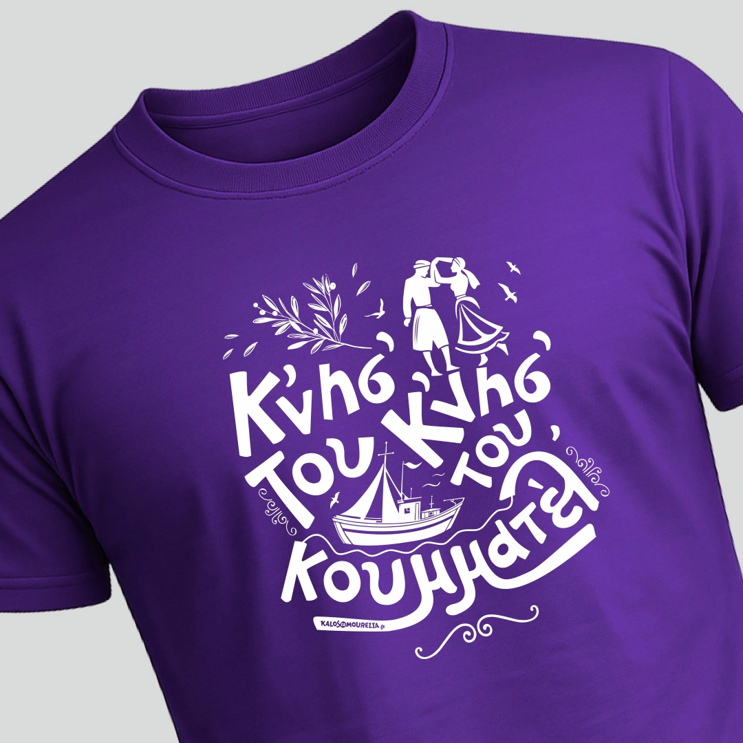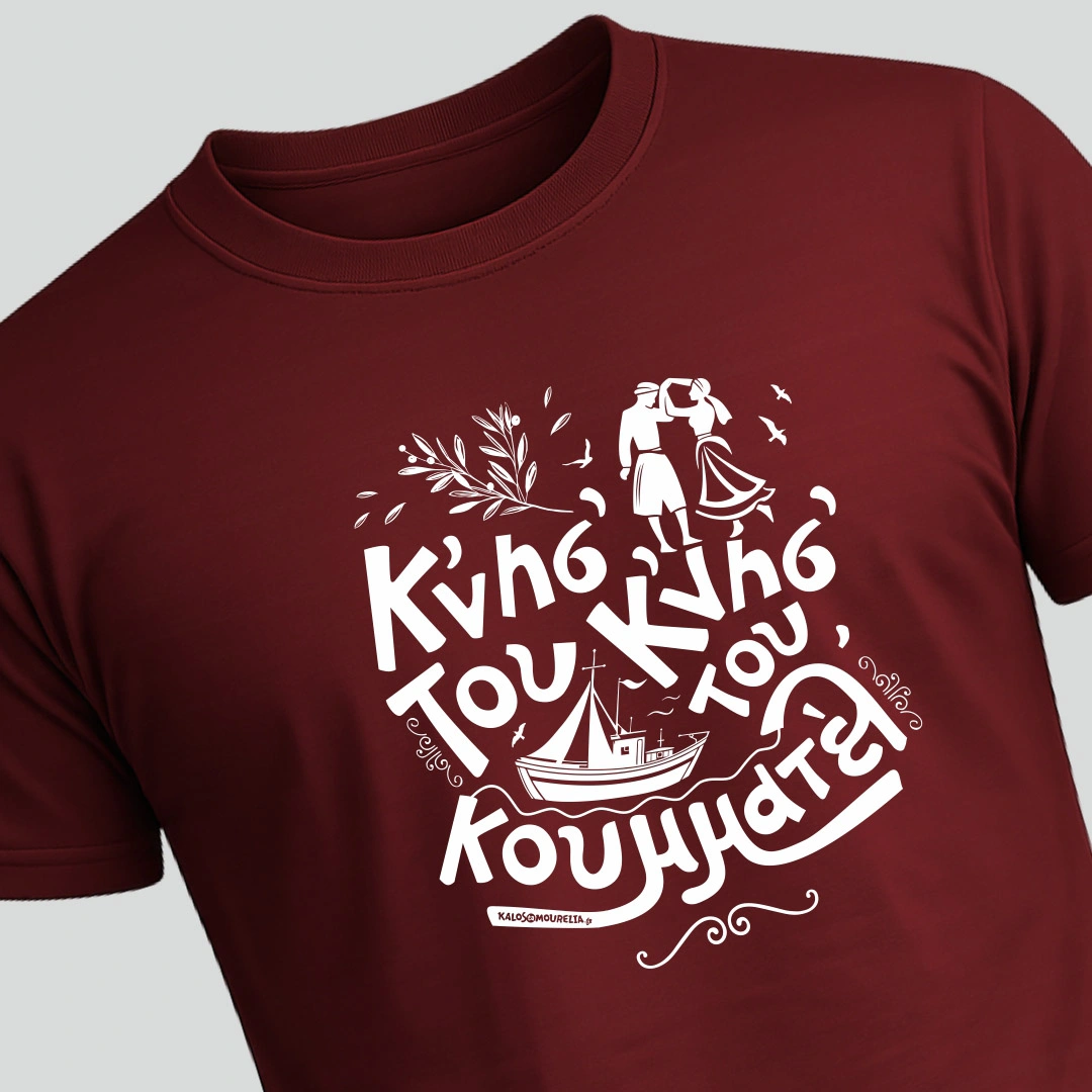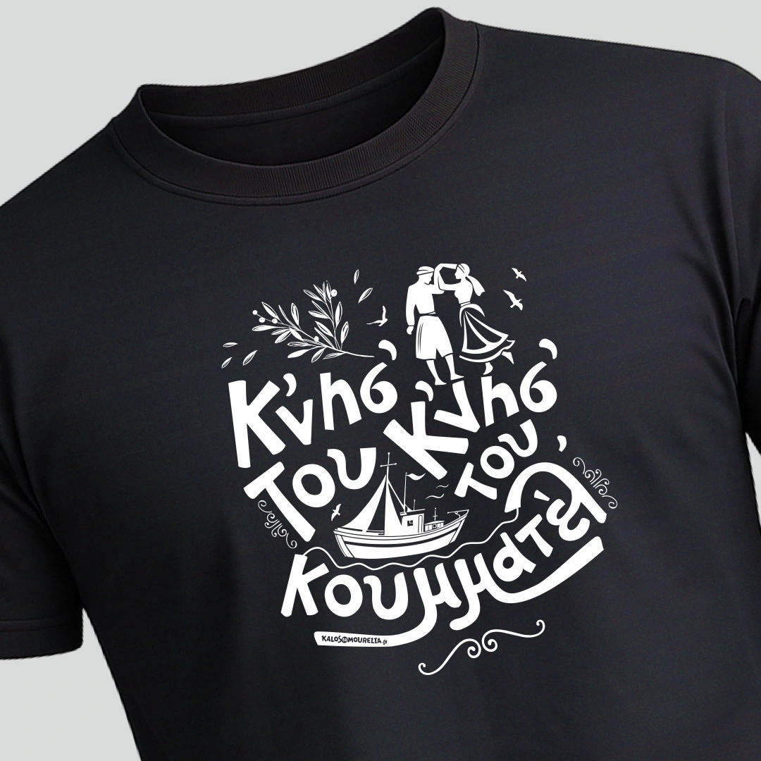 Ο γνωστός στίχος από το παραδοσιακό τραγούδι της Λέσβου, ”Η θεια μ’ η Αμερσούδα” στα μπλουζάκια μας! Η Μυτιλήν’ μας είνι ένα τρανό χουριό, Κνησ’ του κνησ’ του κουμματελ’ σαν βαρκούλα σαν καϊκέλ’. Ας αρχίσουν οι χοροί.