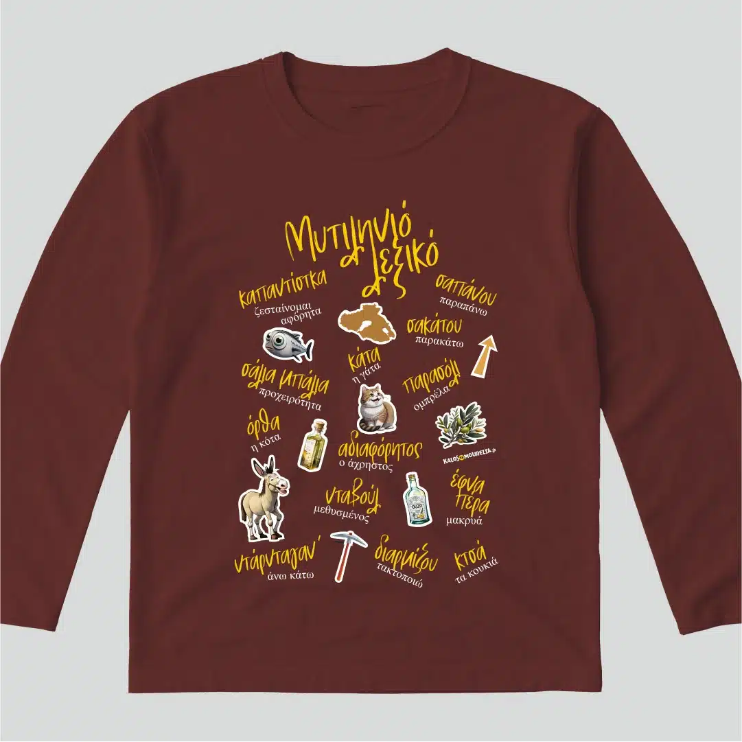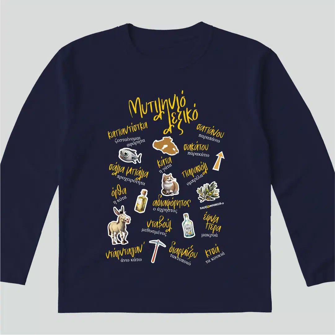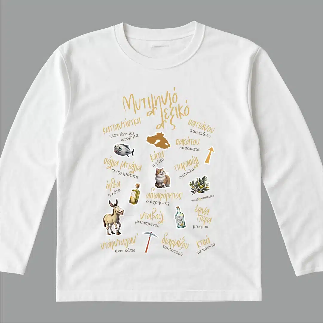 Καπαντίστηκα? Αδιαφόρητος? Νταβούλ? Διαρμίζου? Κτσα? Ντάρνταγαν? Θέλετε μετάφραση? Εδώ την έχουμε στο ΜΥΤΙΛΗΝΙΟ ΛΕΞΙΚΟ. Το σχέδιο που άναψε την σπίθα για να χτίσουμε όλο αυτό, το βλέπετε εδώ μπροστά σας σε μακρυμάνικο μπλουζάκι. Κάποιες από τις χαρακτηριστικές λέξεις του τόπου μας μαζεμένες εδώ σε ένα μπλουζάκι. Ένα δείγμα τέλος πάντων γιατί για να τις αναφέρουμe όλες σίγουρα θα χρειαζόμασταν λεξικό. Χμμ καλή ιδέα. Οκ ίσως στο επόμενο project!