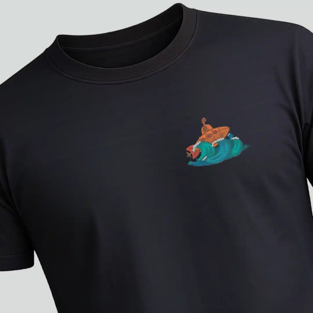 Με ζωντανά χρώματα και χειροποίητη εικονογράφηση του υποβρυχίου πάνω στο κύμα, αυτό το μπλουζάκι συνδυάζει καλλιτεχνικό design με ποιότητα κατασκευής.